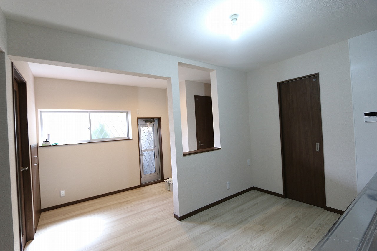 ダイニングキッチンからリビング方向を見たところ。 正面の引き戸を開け放すと、約15畳のLDKになります。